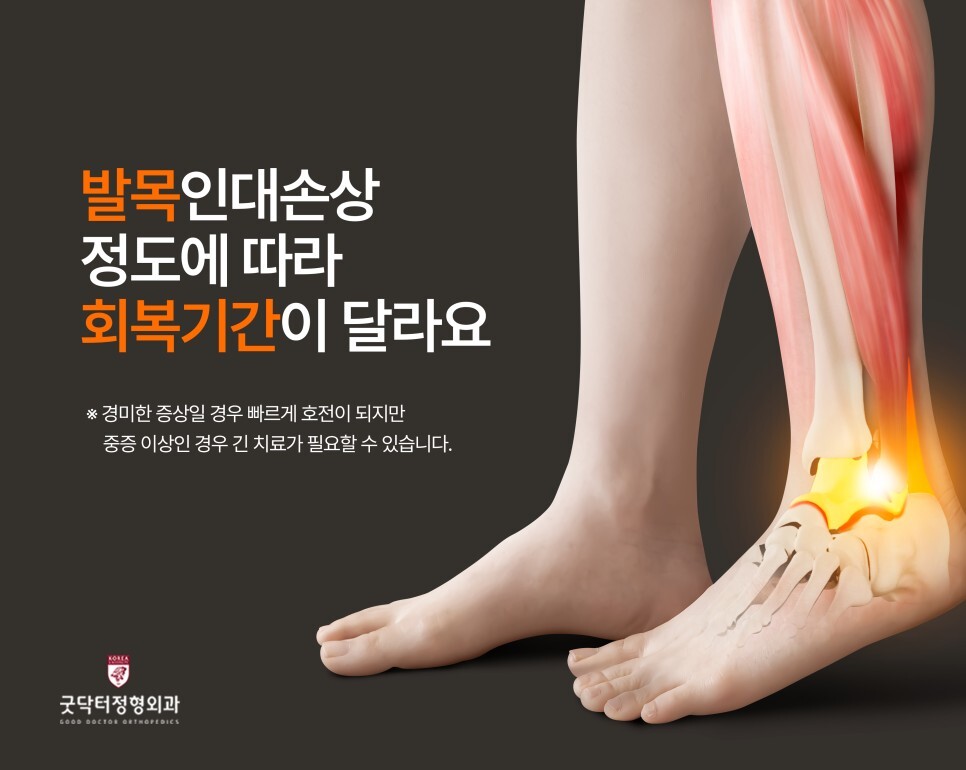 인대는 쉽게 늘어나거나 찢어질 수 있습니다. 발목을 삐었다고 설마 인대가 파열되었겠어라고 넘기지 마시고 통증이 심하게 있다면 꼭 광명사거리병원 굿닥터정형외과로 내원하여 검사받으시길 바랍니다.